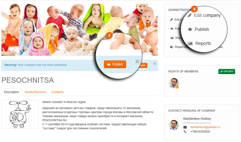 , that all the visitors of service will be able to see the page of the organization. The button "Publish" located in the upper part of the page and duplicated in the module «Administration»